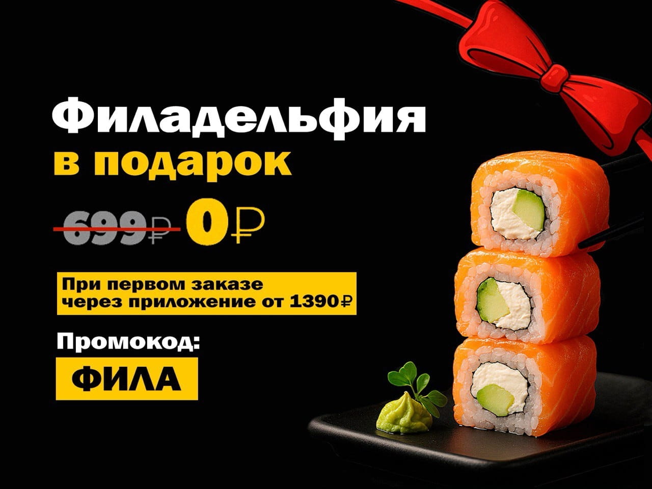 При первом заказе через мобильнон приложение от 1390р дарим нежную и красивую филадельфию с авокадо и толстеньким лососем наши новым гостям!